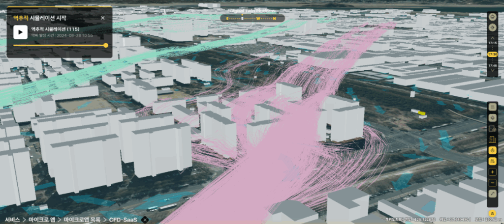 We utilize data on the terrain, buildings, and wind resistance factors near the ground surface of the target site, built on the 3D spatial information platform of the Korea Land and Geospatial Informatix Corporation. To achieve this, we developed an interface module between the spatial data format used on the platform and the data format used in the simulator.