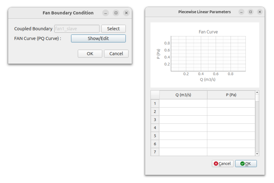 Selecting FAN displays a window like the one below on the left, where you can set Coupled Boundary and FAN Curve. For Coupled Boundary, select fan1_slave for fan1 and fan2_slave for fan2. Clicking the Show/Edit button for FAN Curve displays the window shown below on the right. Open the downloaded performance curve file in a spreadsheet program like Excel, copy the two columns, and paste them into the Q and P fields shown below on the right.