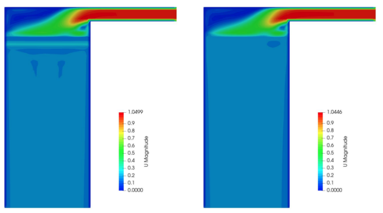 Improved convergence of fan flow (left) OpenFOAM, (right) NextFOAM